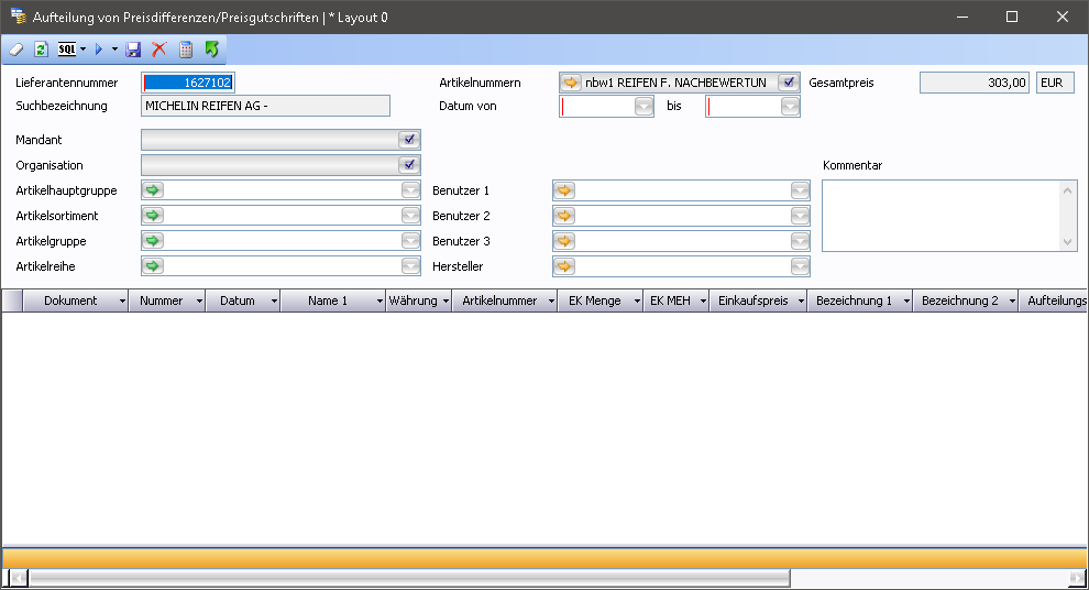 In die Eingangsrechnung wird ein allgemeiner Gutschriftartikel mit Code G erfasst. Zeile markieren und Aufteilung Preisdifferenzen