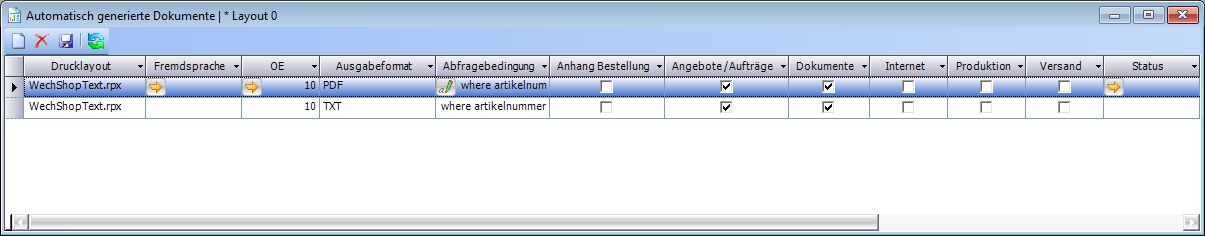 Sobald sich in der Tabelle ein gespeicherter Datensatz befindet, wird beim Speichern im Fenster Artikelstamm die Funktion zur automatischen Generierung von Dokumenten ausgeführt. Es ist dabei auch möglich, mehrere Dokumente für einen Artikel zu erzeugen.