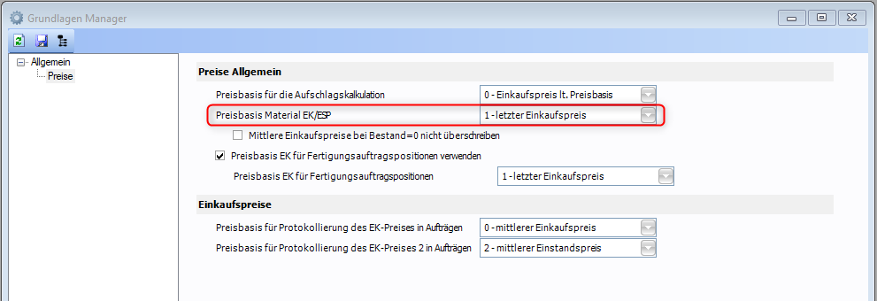 Als Preisbasis wird die Grundlageneinstellung "Preisbasis Material EK/ESP" verwendet.