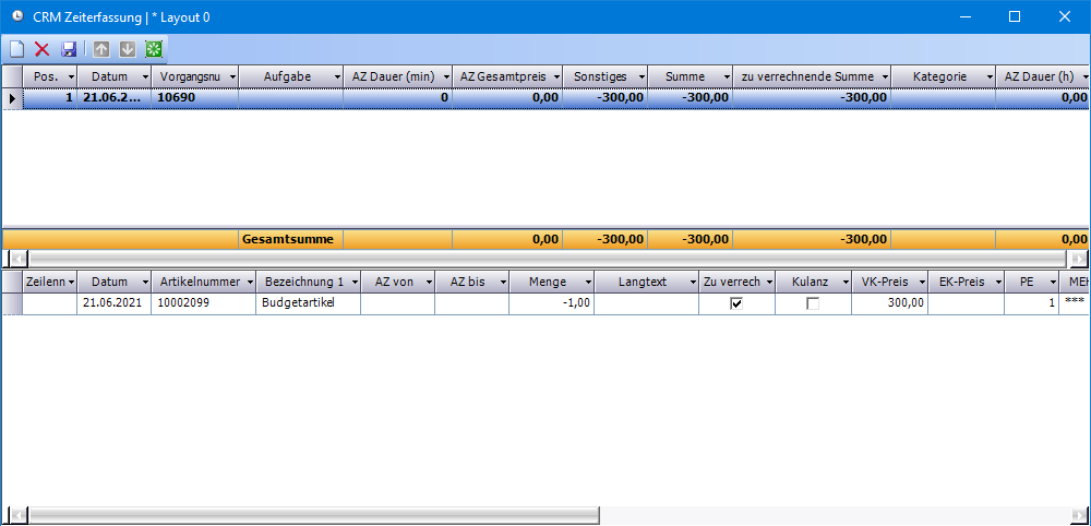 Die Menge ist negativ, damit dann in Folge das Budget auf der Gesamtkostenabrechnung von den Zeiterfassungspositionen abgezogen wird.