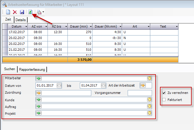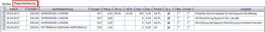 Im Reiter „Rapporterfassung" werden nun alle Ergebnisse, welche die zuvor eingegebenen Kriterien erfüllen, angezeigt.