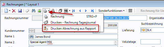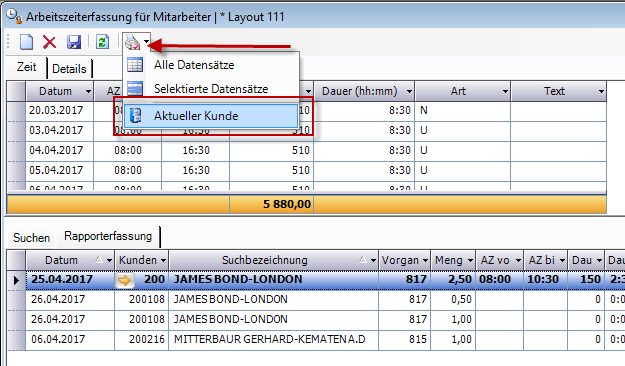 Um nun die Gesamtkostenabrechnung für einen bestimmten Kunden zu erstellen, wählt man eine Zeile des Kunden aus und klickt auf das Drop-Down-Menü beim Button „Drucken Abrechnung aus Rapport". Mit der Option „Aktueller Kunde" werden alle Zeilen dieses Kunden selektiert.