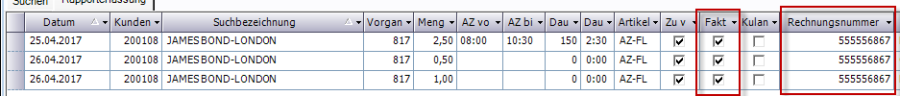 Mit der Erstellung der Rechnung wurden die abgerechneten Dienstleistungen als „fakturiert" markiert und die zugehörige Rechnungsnummer eingetragen.