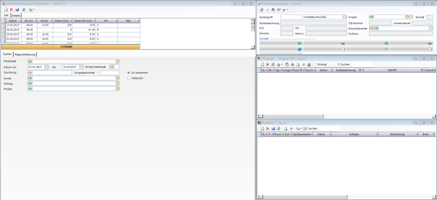 Um eine Gesamtkostenabrechnung zu erstellen empfiehlt es sich, einen eigenen Geschäftsprozess „Abrechnung Dienstleistung" zu erstellen und zu verwenden. Dieser beinhaltet die Fenster „Arbeitszeiterfassung für Mitarbeiter", „CRM Partnerkontakte", „Vorgänge" sowie „Aufgaben".