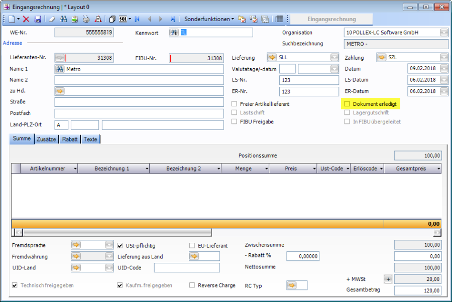 Um eine Belastungsnote zu erstellen darf die betreffende Eingangsrechnung nicht mit „Dokument erledigt" markiert aber muss technisch und kaufmännisch freigegeben sein.