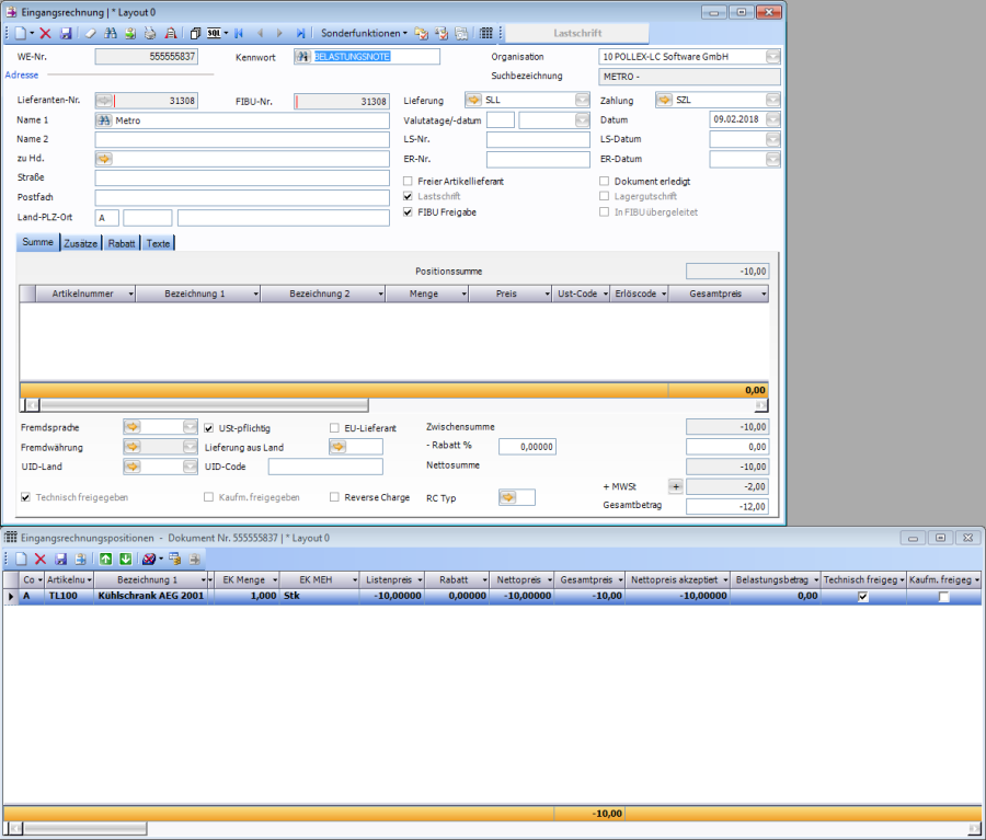 Eingangsrechnung einen zum Nettopreis abweichenden Nettopreis akzeptiert und somit einen Eintrag in Belastungsbetrag hatten. Dieser Belastungsbetrag wird in der Belastungsnote mit negativem Vorzeichen in den Nettopreis eingefügt. Der Gesamtbetrag der Belastungsnote ergibt sich somit aus