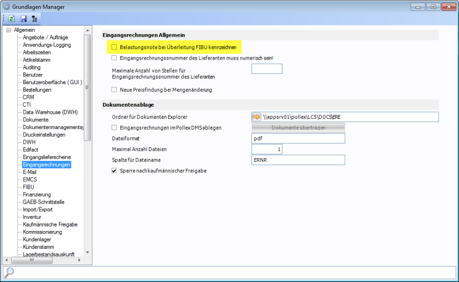 Mit dem Grundlagenschalter „Belastungsnote bei Überleitung FIBU kennzeichnen" wird gesteuert, ab welchem Zeitpunkt die Erstellung der Belastungsnote grundsätzlich möglich ist. Bei deaktivierter Option darf eine Belastungsnote bereits ab der kaufmännischen Freigabe der Eingangsrechnung