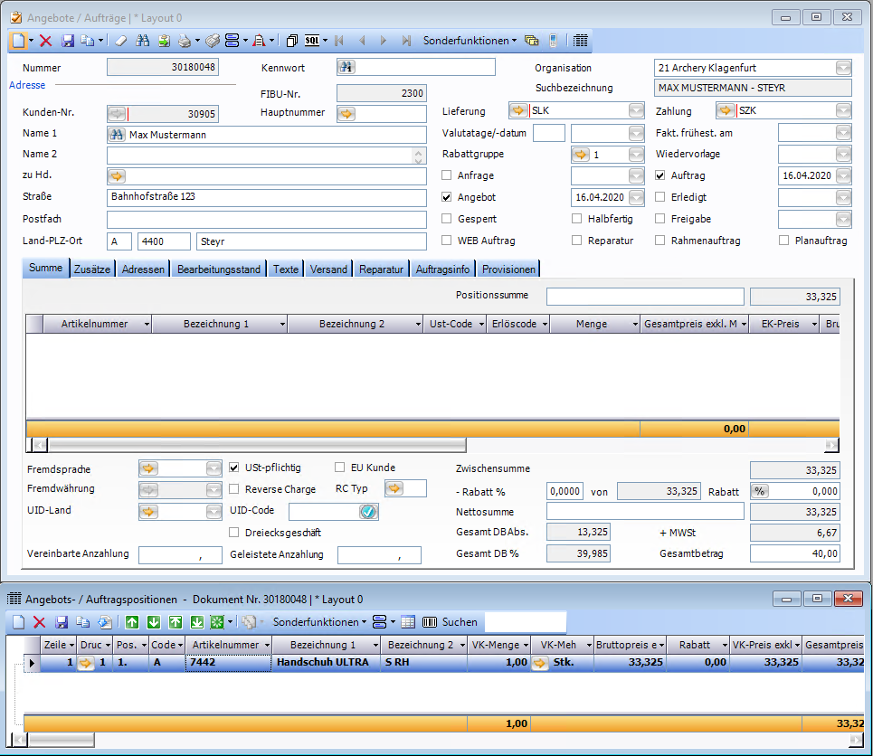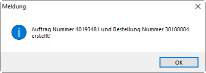 Es wird die Information angezeigt, dass ein Auftrag und eine Bestellung erstellt wurden.