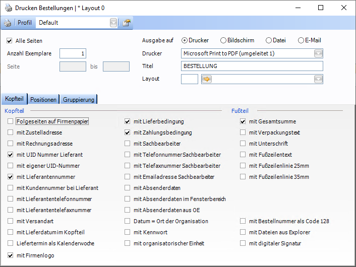 Zusätzlich öffnet sich das Druckdialogfenster für die erstellte Bestellung. Hieraus kann die Bestellung für die eigene OE gleich gedruckt bzw. per E-Mail an die liefernde OE gesendet werden.