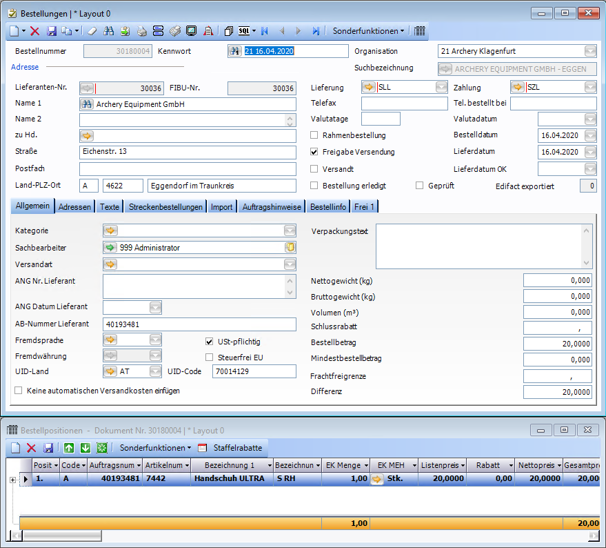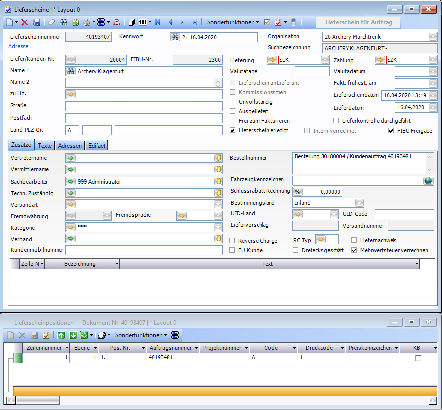 Wird aus einem Auftrag, welcher aus Bestellung für andere OE erstellt wurde ein Lieferschein gemacht, dann wird dieser automatisch erledigt gesetzt, da eine Verrechnung zwischen OEs innerhalb eines Unternehmens normalerweise nicht benötigt wird.