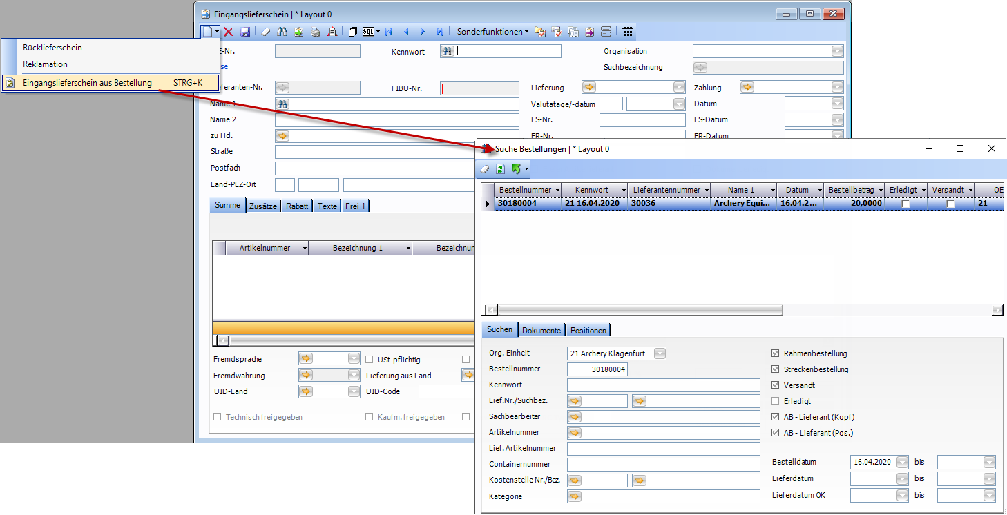 Dafür kann z.B. die Funktion Eingangslieferschein aus Bestellung direkt im Fenster Eingangslieferschein verwendet werden. Beim Betätigen dieser Option öffnet sich das Fenster Suche Bestellungen und es kann die entsprechende Bestellung gesucht und übernommen werden.