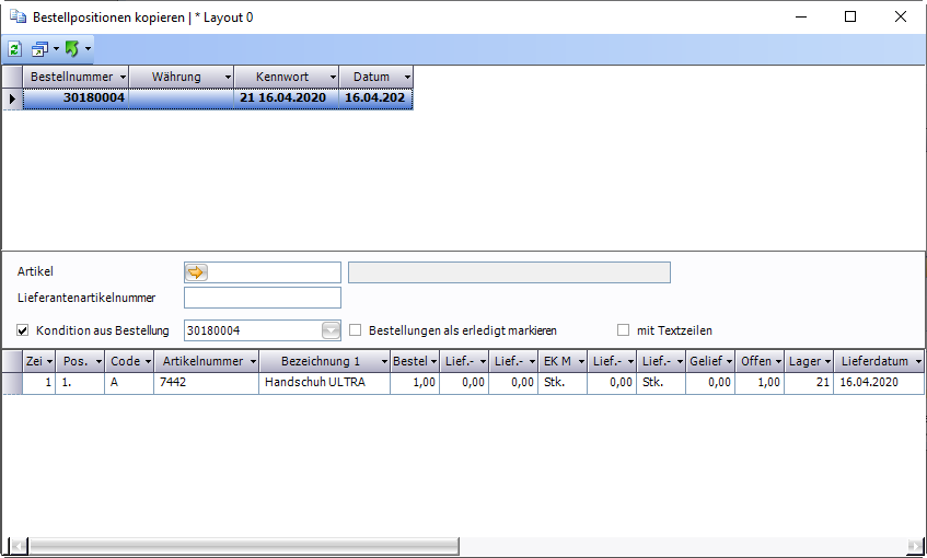 Hier wird beispielhaft ein mögliches Layout für das Fenster Bestellvorschlag bearbeiten für Bestellung bei anderer OE gezeigt. Im Laoyut 0 ist das Fenster umfangreicher, in diesem Layout befinden sich die wichtigsten Felder für eine Bestellung bei einer anderen OE.