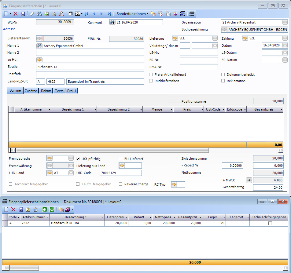Die Nummer und das Datum aus dem Ausgangslieferschein werden dabei automatisch im Eingangslieferschein in die dafür vorgesehenen Felder eingetragen (LS-Nr., LS-Datum).