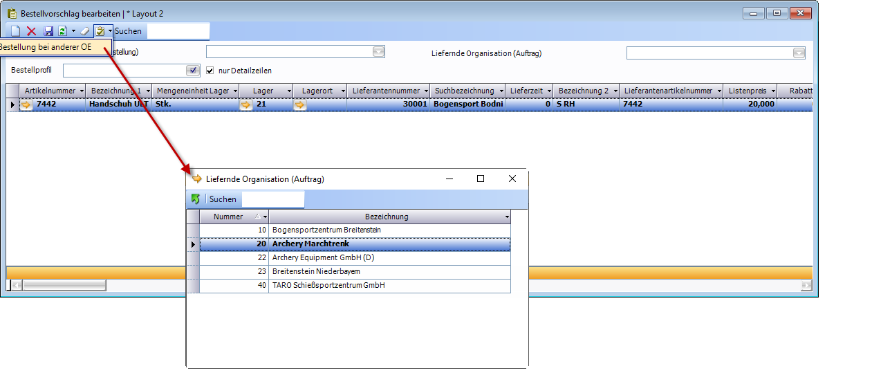 Wurde von einem Kunden ein Artikel beauftragt, welcher aktuell in der Filiale nicht verfügbar ist, dann kann dieser neben Bestellung beim Lieferanten auch über eine Bestellung bei einer anderen OE in die eigene Filiale bestellt werden um den Kundenauftrag bearbeiten zu können.
