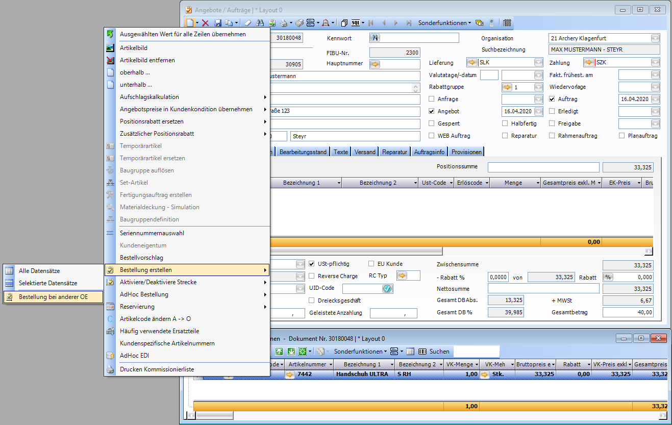 Dazu kann mit Rechtsklick auf die zu bestellende Position, anschließender Auswahl von Bestellung erstellunen und betätigen von Bestellung bei anderer OE eine Bestellung bei einer anderen Filiale ausgelöst werden.
