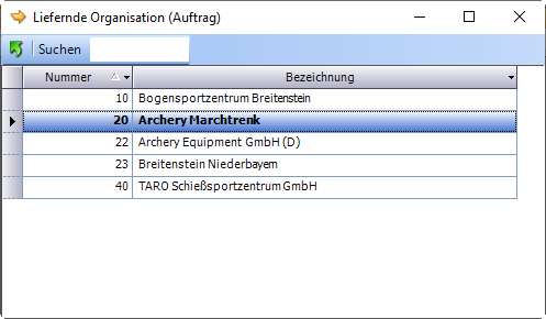 Wird nun ein neuer Artikel in den Bestellovrschlag manuell eingefügt und markiert, oder eine Position aus einem bestehenden Bestellvorschlag markiert und Bestellung bei anderer OE betätigt, öffnet sich im oben ersichtlichen Beispiel ein Auswahlfenster für die liefernde Organisation, da diese im Fenster nicht ausgewählt wurde. Wird hier OE 20 ausgewählt, dann wird in weiterer Folge automatisch ein Auftrag für OE 20 und eine Bestellung für OE 21 erstellt (da der angemeldete Benutzer der OE 21 zugeordnet ist).