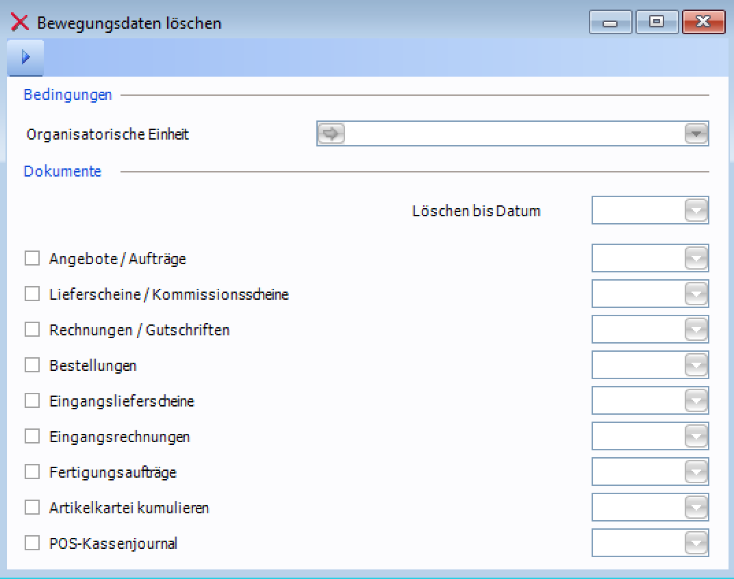 Das Fenster "Bewegungsdaten löschen" bietet die Möglichkeit, eine Datenbereinigung durchzuführen. Im Normalfall wird diese Funktion verwendet um Altdaten aus dem System zu entfernen oder bei neuen Datenbanken nach den Einschulungen der Mitarbeiter die Schulungsdaten wieder zu entfernen.