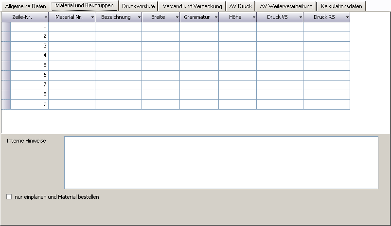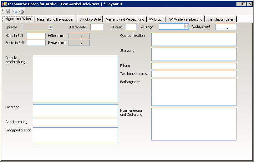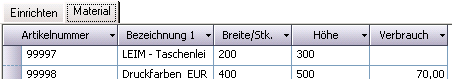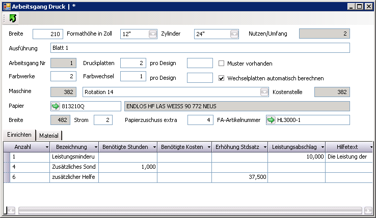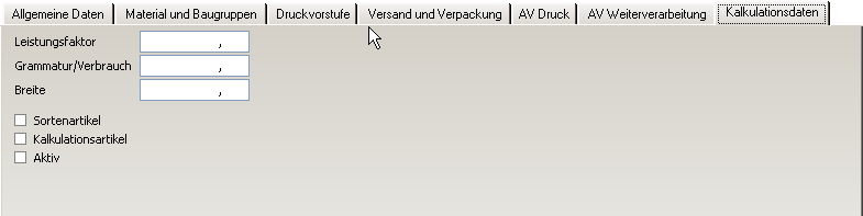 - Technische Artikeldaten: Pflege der Kalkulationswerte für Materialien (Grammatur, Verbrauch, Breite, Leistungsfaktor, etc…) im Fenster technische Daten Artikel.