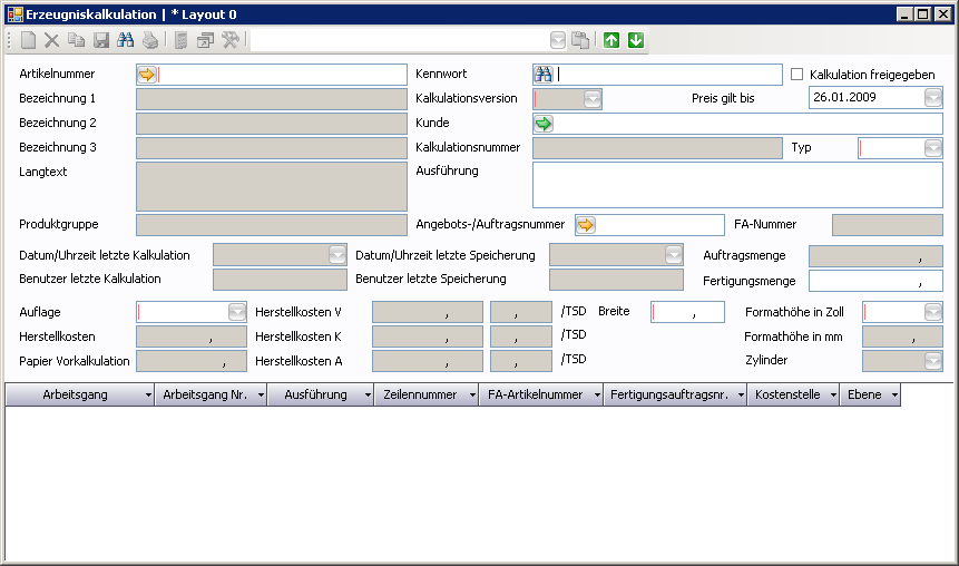 Fensterübersicht Erzeugniskalkulation