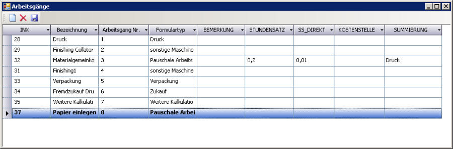 Im Tabellenbereich des Fensters Erzeugniskalkulation werden die Arbeitsgänge verwaltet.