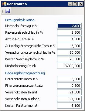 BRA_Print | BRA_Print. | Vorgabewertefenster für Konstanten der Erzeugniskalkulation und DB-Rechnung |
