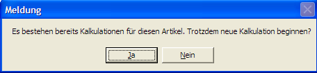 Wenn zu einem Artikel bereits eine Kalkulation besteht, wird Meldung angezeigt: