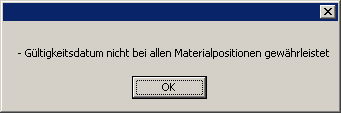 Prüfen des Gilt bis Datums sämtlicher Materialpositionen. Bei Nichterfolg erscheint die Meldung: