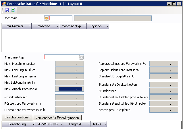 - Technische Daten Maschine: Pflege der technischen Daten für Maschinen im Fenster technische Daten Maschine.