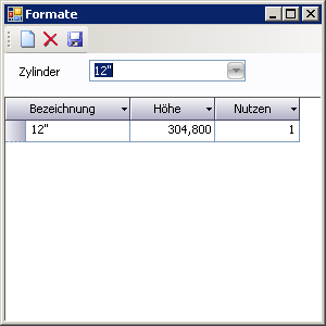 Zylinder | Auswahl des zu verwendenden Zylinders aus dem Listfeld. Das Listfeld aktualisiert sich nach Eingabe einer Formathöhe selber mit den möglichen Zylindergrößen. |