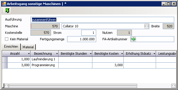 Hinweis: Im Tabellenteil kann außer der FA-Artikelnummer nicht direkt editiert werden. Die FA-Artikelnummer ist jene Habfabrikatsnummer die durch diesen Arbeitsgang produziert wird.