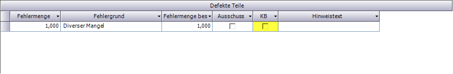 Dadurch wird in der unteren Tabelle Defekte Teile eine neue Zeile angelegt.
