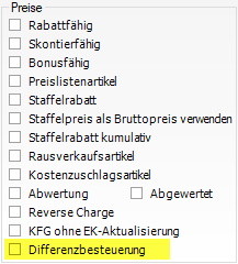 Um die Differenzbesteuerung zu aktivieren muss nur im Artikelstamm auf der Karteikarte Eigenschaften die Option Differenzbesteuerung aktiviert werden.