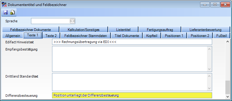 Artikel mit Differenzbesteuerung müssen am Ausdruck des Dokuments gekennzeichnet werden. In den Dokumententitel kann ein entsprechender Text eingetragen werden.