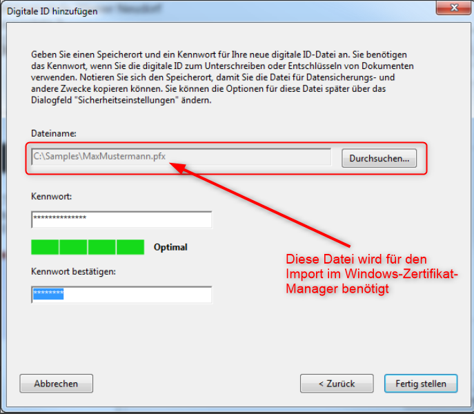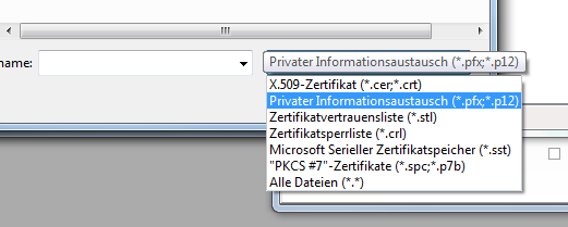 5. Wählen Sie die .pfx Datei aus, die Sie zuvor erstellt haben – achten Sie dabei auf die Auswahl des Dateityps: