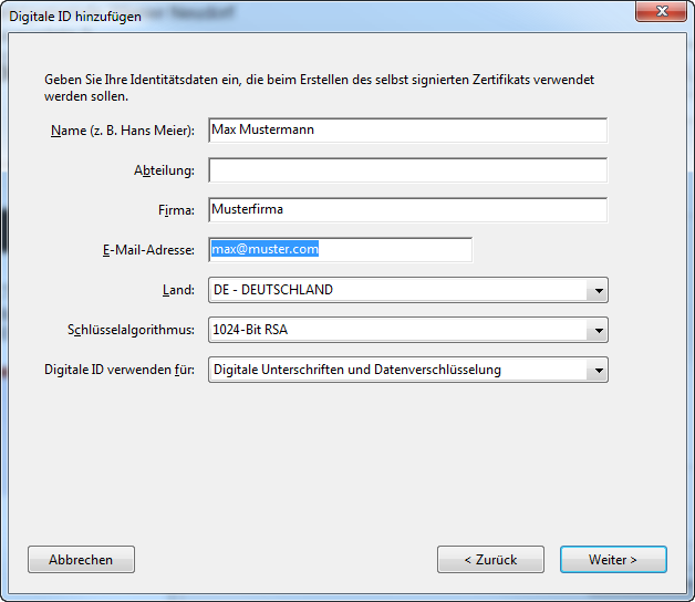 Nachfolgend wird die Erstellung eines selbst-signierten Zertifikats mit Adobe Reader XI Schritt für Schritt dargestellt: