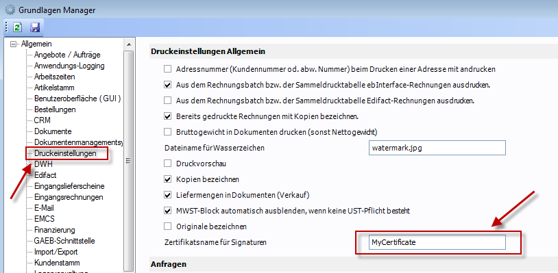 2.Geben Sie im Feld „Zertifikatsname für Signaturen" den von Ihnen frei wählbaren Zertifikatsnamen an. ACHTUNG: Dieser Name muss auch bei allen Clients beim Import des Zertifikates hinterlegt werden!