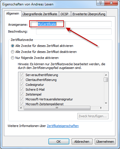10. Das Zertifikat wird nun angezeigt – es muss nun noch ein NAME für dieses Zertifikat vergeben werden.