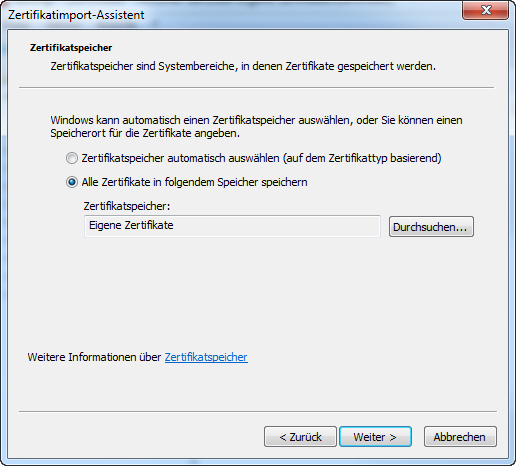 8. Speichern Sie das Zertifikat ein „Eigene Zertifikate" - Weiter