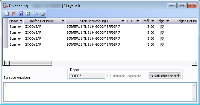 Ein virtueller Lagerplatz wird dann verwendet, wenn man Reifendaten erfassen möchte, diese aber nicht physisch auf einem Depot gelagert werden (der Kunde lagert diese selber).