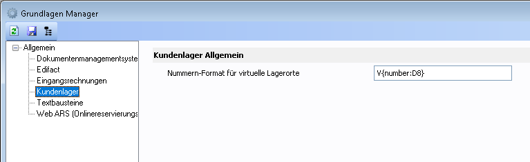 Wenn ein Kunde zuvor einen virtuellen Lagerplatz erhalten hat, bleibt diese Nummer bei der nächsten Aus-/Einbuchung erhalten, ansonsten wird immer eine neue Nummer vergeben. - Es kann für einen virtuellen Lagerplatz ein Format in den Grundlagen vorgegeben werden, bsp. beginnend mit "V" und 8-stellig.
