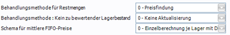 Die Restmenge wird mit dem EK aus der Datenübername aktualisiert (ARTIKELSTAMM.EK_DUEB). Ist kein Datenübernahmepreis vorhanden wir diese mit dem aktuellem EK (vor der FIFO-Bewertung) bewertet. Nachteil: Bei jeder Aktualisierung ändert sich dadurch der Mittel-EK, da die Restmenge immer mit dem aktuellen EK bewertet wird und der Mittel-EK neu berechnet wird. Im nächsten Durchlauf wird die Restmenge, dann mit dem Mittel-EK aus dem vorigen Durchlauf bewertet und wieder eingerechnet usw. | Drei neue Optionen im Grundlagenmanager
