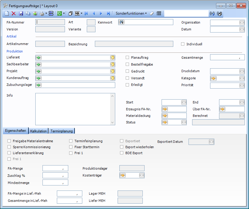 Wenn Lieferant leer ist, oder der Lieferant zugeordnet ist, der in Grundlagen in Lieferant für eigene Produktion gespeichert ist, handelt es sich um einen Fertigungsauftrag für die eigene Produktion.