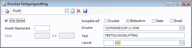 Mit Drucken wird das Druckdialogfenster zum Druck des Fertigungsauftrags geöffnet.