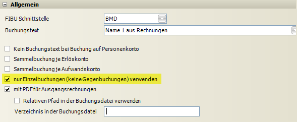 Der FIBU-Konfigurator ist nur für die BMD und RZL Buchhaltungsschnittstelle verfügbar. Verwendet werden kann er nur dann, wenn die in den FIBU-Einstellungen beschriebenen gelb markierten Einstellungen aktiviert sind. Nur wenn die erforderlichen Einstellungen getroffen sind, kann eine Konfiguration vorgenommen werden.