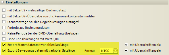 Die variable Satzlänge für die Stammdaten und/oder die Bewegungsdaten muss aktiviert und als Format das NTCS-Format ausgewählt sein.