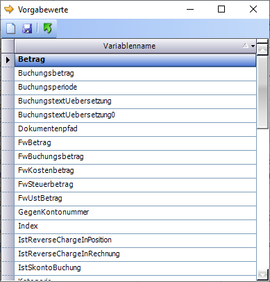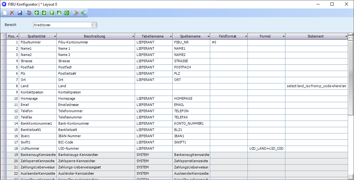 Zu den Tabellen KUNDEN, LIEFERANT und KONTIERUNG werden alle Spalten aus der Datenbank angezeigt. Die Tabelle CONSTANT hat keine Spaltennamen. Bei der Tabelle SYSTEM werden die vom System verwendeten Variablen angezeigt. Ja nach verwendeter FIBU-Schnittstelle werden hier unterschiedliche Variablen angezeigt. Bei der BMD Buchhaltung ist z.B. der Buchungstext in einer Variable und bei der RZL Buchhaltung wird der Buchungstext in zwei Variablen gespeichert wenn dieser länger als 20 Zeichen ist.
