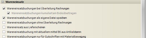 Wenn Wareneinsatzbuchungen exportiert werden sollen muss bei der Verwendung des FIBU-Konfigurators für die Wareneinsatzbuchungen eine eigene Konfiguration verwendet werden. Es muss dann auch die Option "Wareneinsatzbuchung als eigene Datei speichern" aktiviert werden.