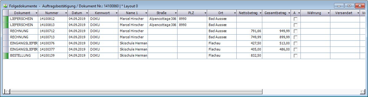 Wird beispielsweise aus einem Auftrag ein Lieferschein und in weiterer Folge eine Rechnung erstellt, sind diese Dokumente miteinander verwandt - wird der Auftrag ausgewählt, werden Lieferschein und Rechnung als Folgedokumente angezeigt. Wird der Lieferschein ausgewählt, werden Auftrag und Rechnung als Folgedokumente angezeigt.