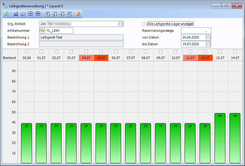Der Diagrammbereich zeigt die Verfügbarkeit des Leihgerätes im Zeitablauf entweder als Balken- oder Punktdiagramm. Über die Symbole +/- Tage oder durch Eingabe eines Datumsbereiches im Abfragebereich werden die angezeigten Tage gesteuert.