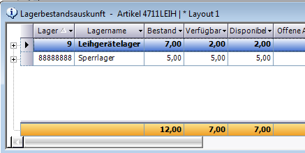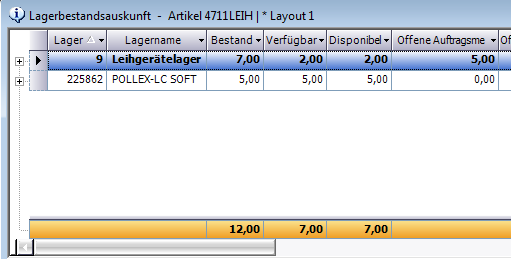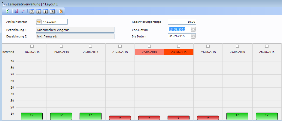Beispiel: Reservierungsmenge 10, Normalbestand 12, offener Leihgeräteauftrag mit 5 Stück vorhanden